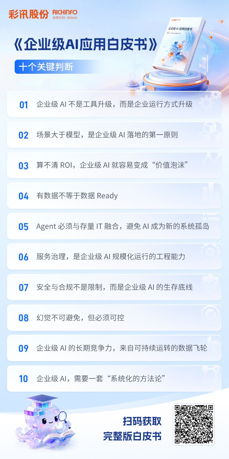 在这些现实约束下,彩讯股份《企业级 AI 应用白皮书》中,把企业推进 AI 落地过程中反复遇到的问题梳理出来,帮助企业在不同阶段更好地把握方向和推进节奏。